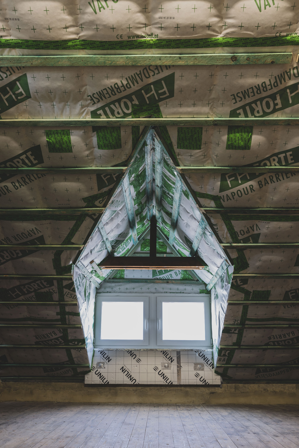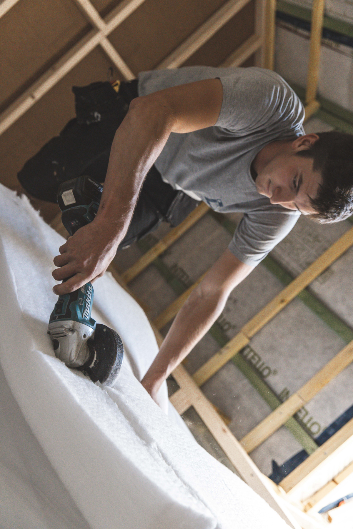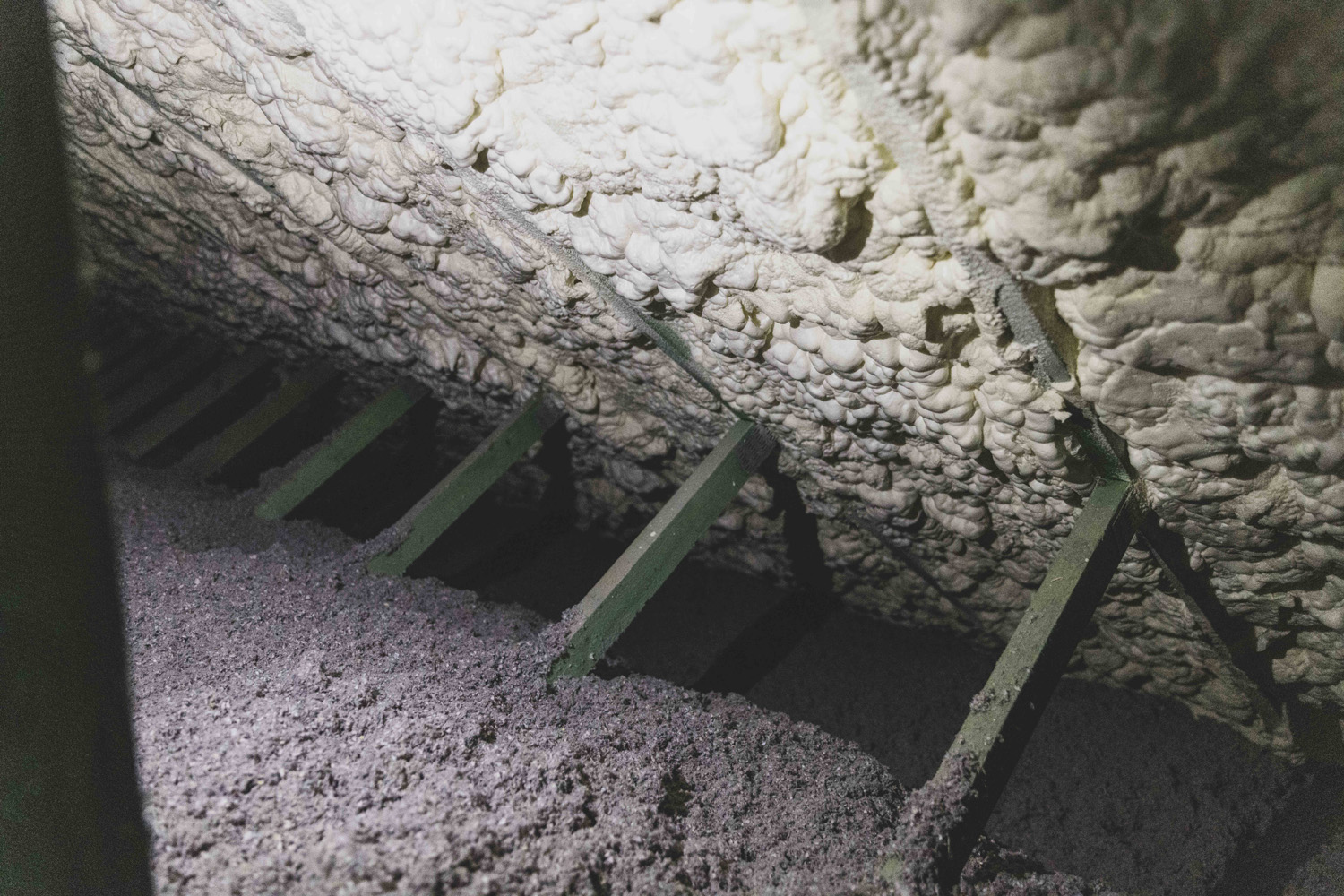 - Isolation toiture par l’extérieur : application d’une mousse isolante projetée qui épouse parfaitement les formes de la structure. Cette technique permet une isolation continue, proche du volume à protéger, sans ponts thermiques.