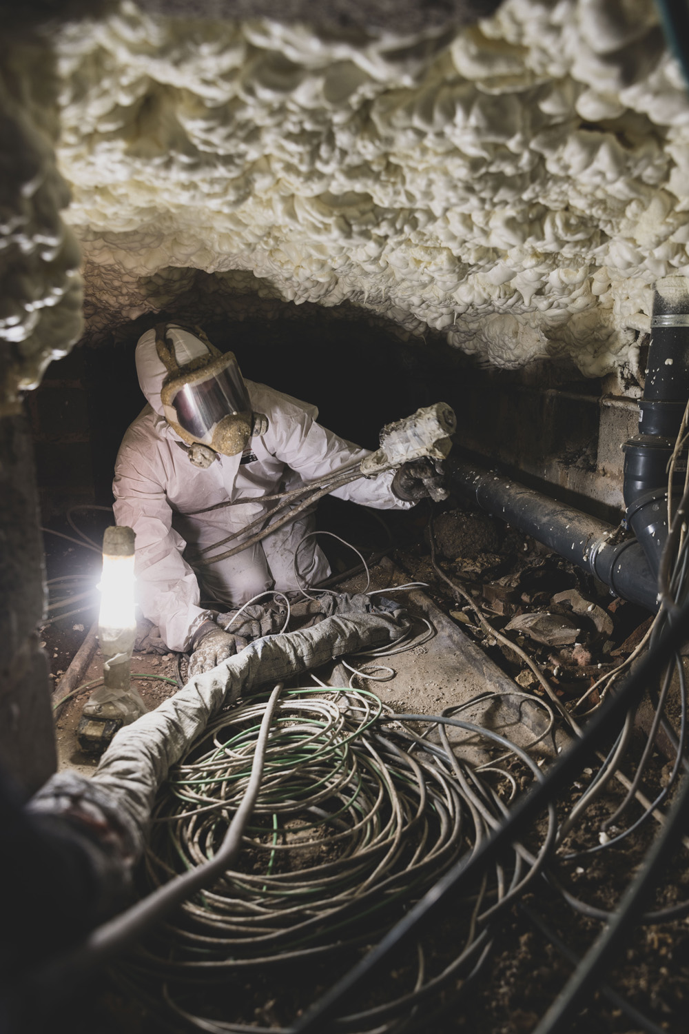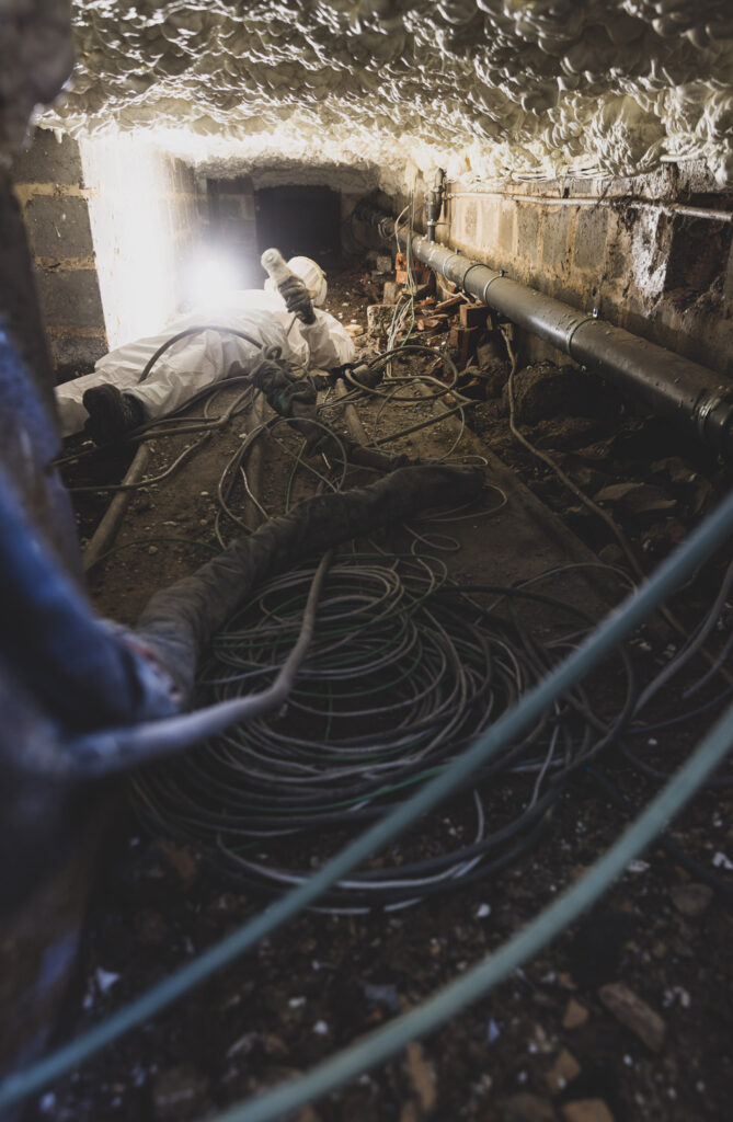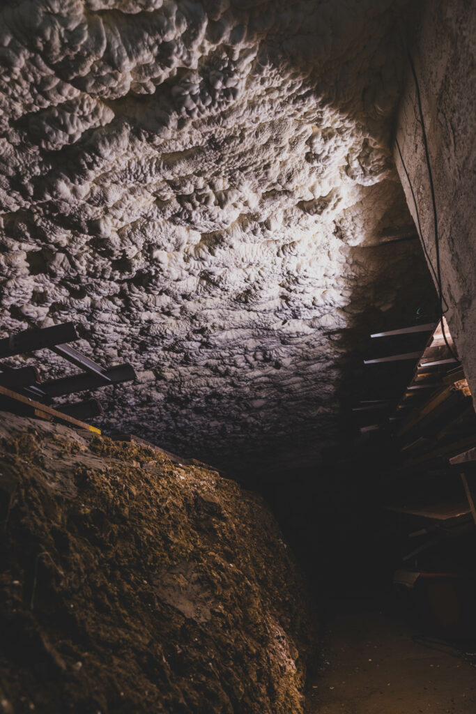 La mousse projetée épouse parfaitement la structure sous dalle, assurant une isolation continue et sans découpe. Ce procédé permet de réduire les pertes énergétiques tout en augmentant la qualité de vie dans les espaces situés au-dessus du vide ventilé.